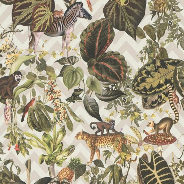 Die Kombination aus Leopard, Affe und Zebra in einem Dschungel-Motiv ist ein echter Hingucker. Jedes Tier ist mit viel Liebe zum Detail gezeichnet und verleiht der Tapete eine lebendige und dynamische Ausstrahlung. Die verschiedenen Grüntöne der Blätter und Pflanzen sorgen für eine beruhigende und natürliche Umgebung, die zum Entspannen und Wohlfühlen einlädt.
