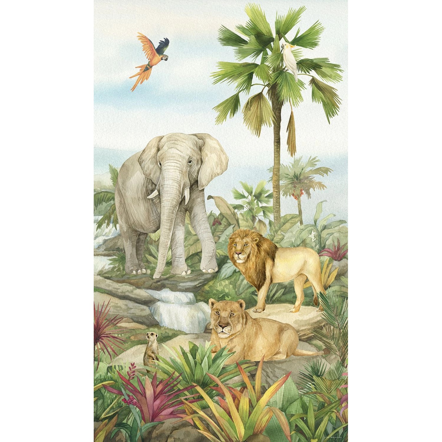 Tauchen Sie ein in eine Welt voller Abenteuer und Farben mit der Sanders & Sanders Fototapete „Dschungeltiere Grün“. Diese atemberaubende Tapete verwandelt jeden Raum in eine lebendige Dschungellandschaft und bringt die Magie der Wildnis direkt in Ihr Zuhause. Mit ihren Maßen von 1,5 x 2,7 Metern ist sie ideal, um einen beeindruckenden Akzent zu setzen – sei es im Kinderzimmer, Wohnzimmer oder sogar im Büro.
