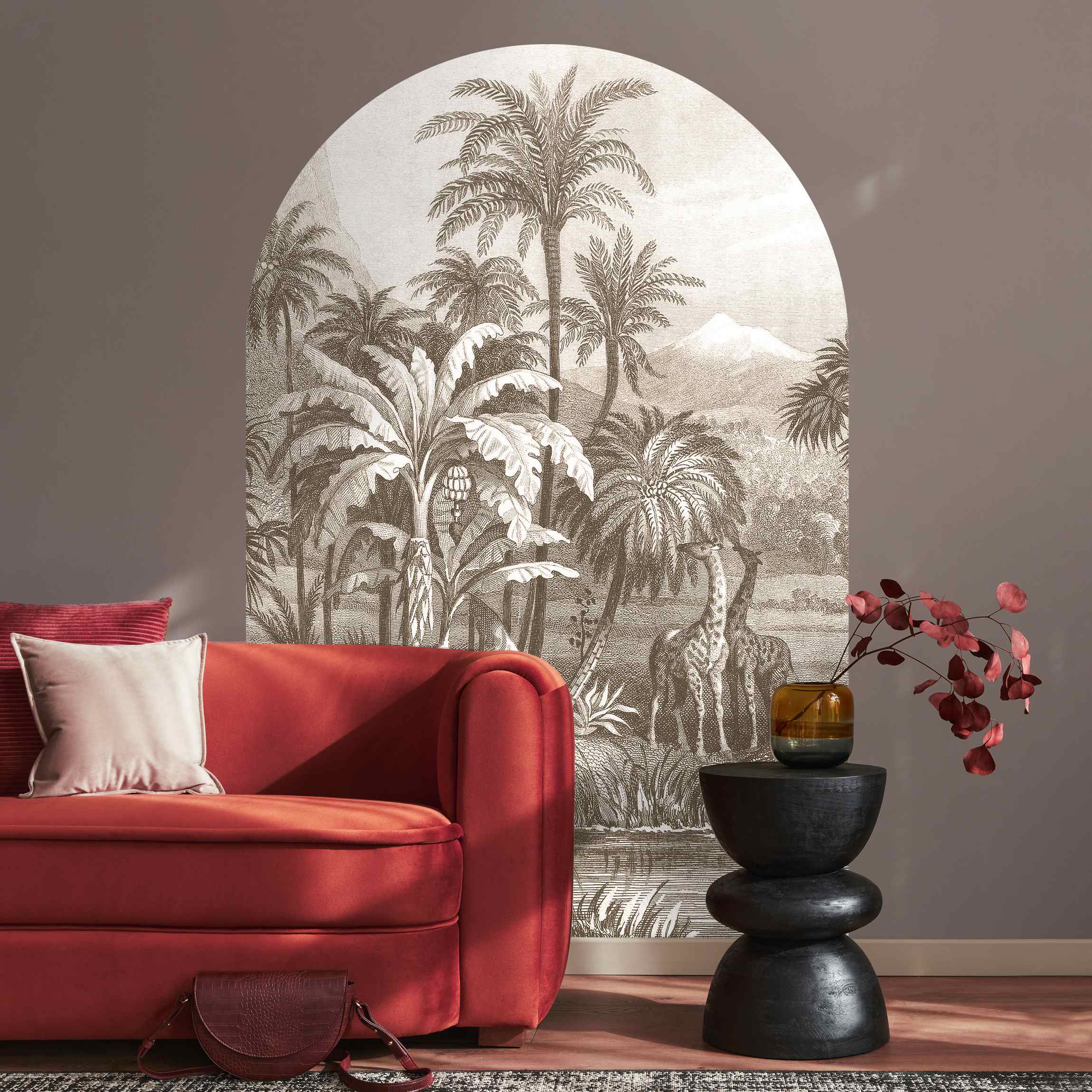 Rundbogen Tapete Tropischer Kupferstich mit Giraffen in Braun